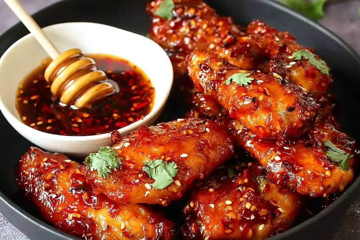 Hot Honey Chicken Wings baked until crispy and tossed in a sweet spicy honey chili sauce. Perfect for game day, parties, or an easy flavorful snack.