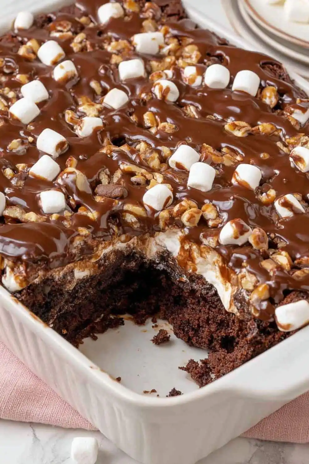 Mississippi mud cake is a rich, fudgy chocolate cake topped with gooey melted marshmallows, crunchy pecans, and a smooth chocolate icing that melts into every bite.