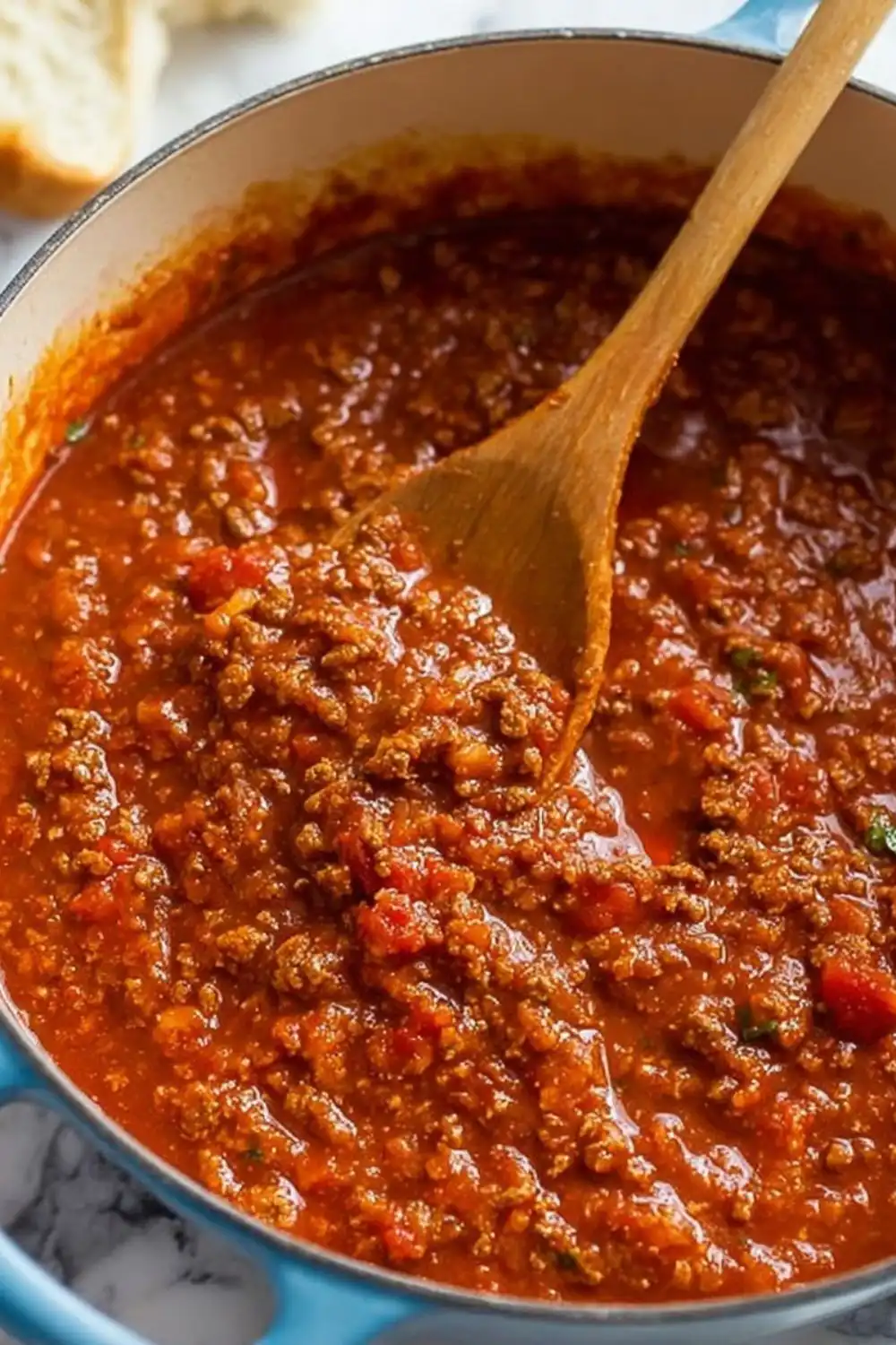 Rushing the simmer prevents the seasonings from fully marrying and the meat from becoming tender enough to disappear into the sauce. A sauce simmered only fifteen to twenty minutes tastes raw, disjointed, and flat. The full forty-five minutes allows flavors to meld, develop complexity, and create the characteristic rich, rounded taste of authentic meat sauce.