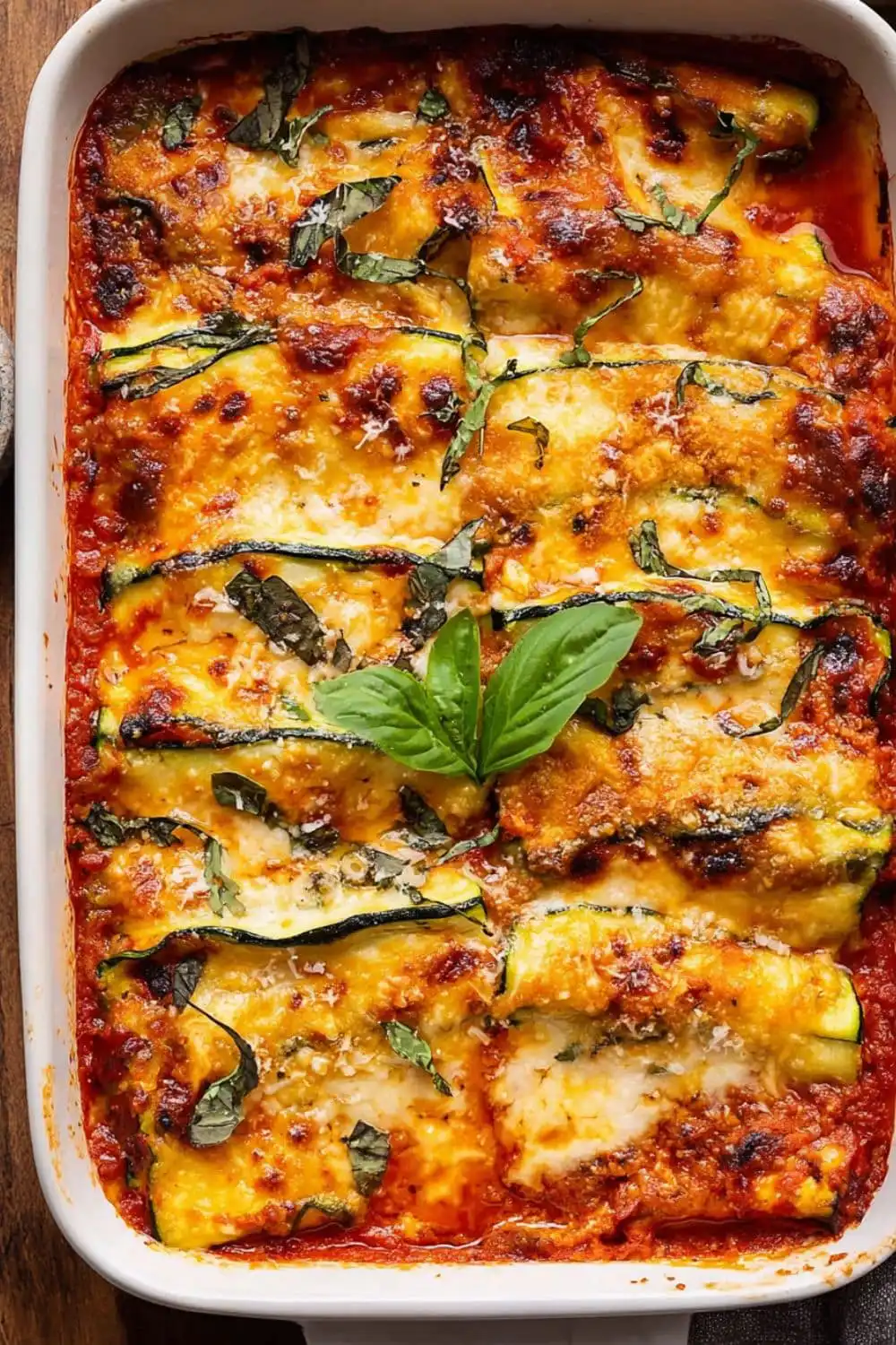 Zucchini lasagna tastes best when served warm after resting for about ten minutes. This resting time helps the layers settle so the slices hold their shape when cut.