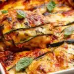 Zucchini lasagna made with thin zucchini slices, ricotta filling, tomato sauce, mozzarella, and parmesan. A simple homemade low-carb dinner.